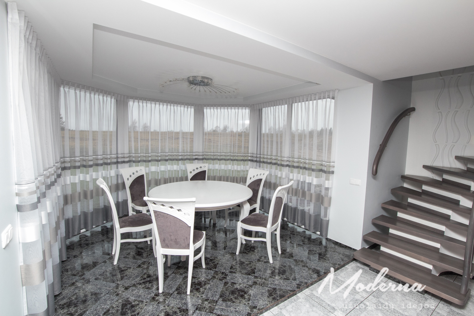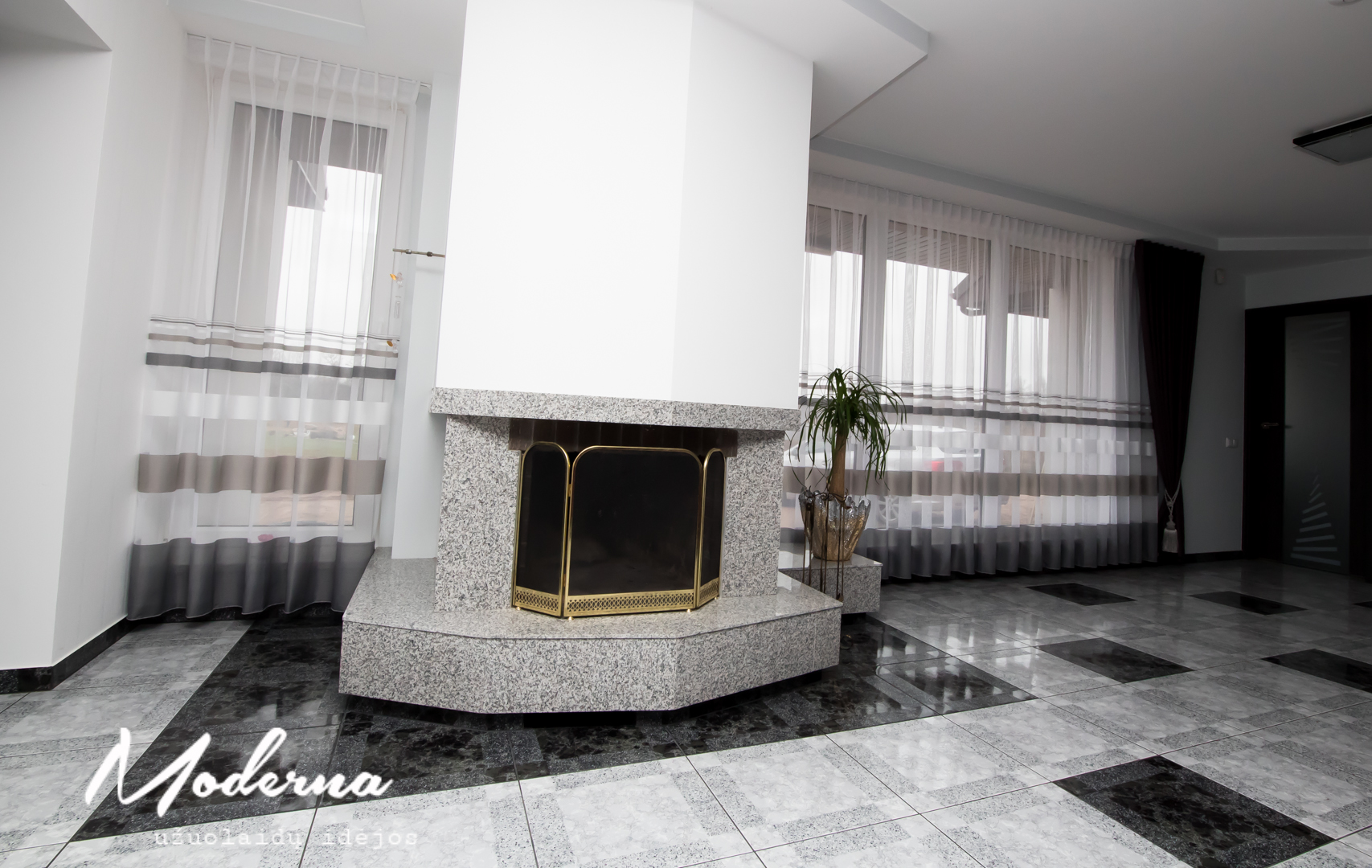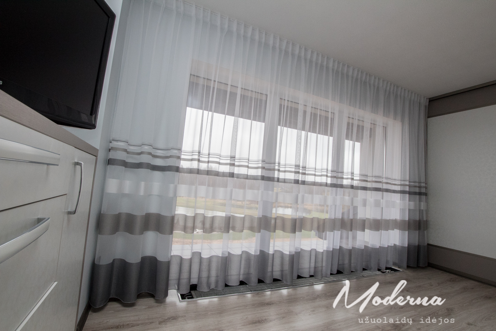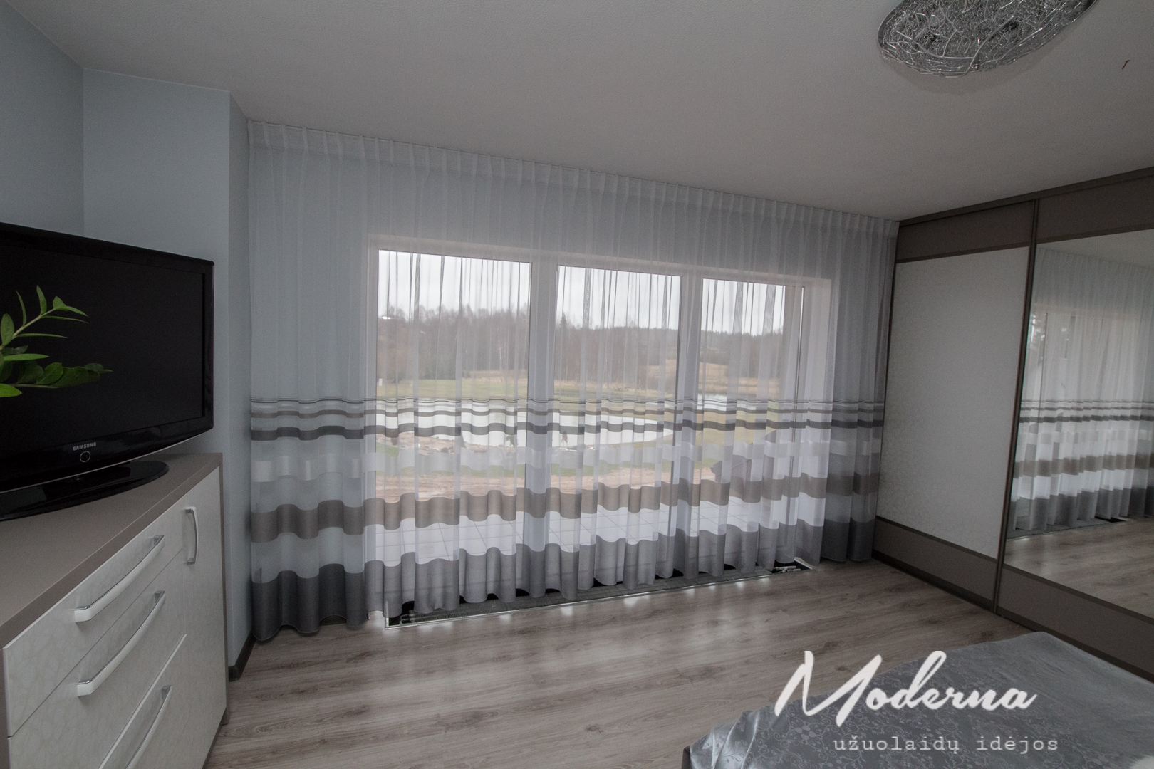 Šiuos namus papuošė užuolaidos su pilkų tonų juostelių intarpais audinyje.