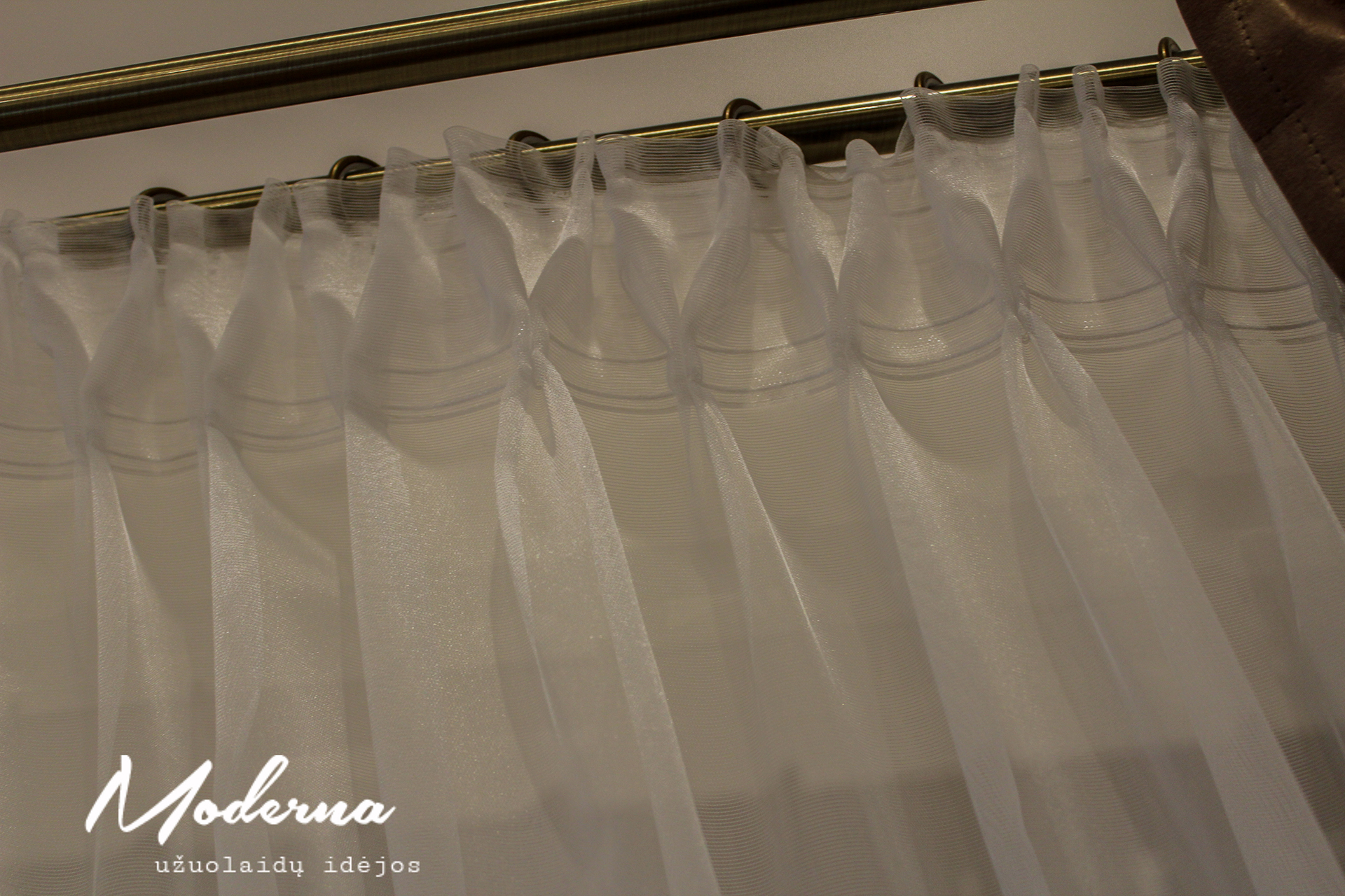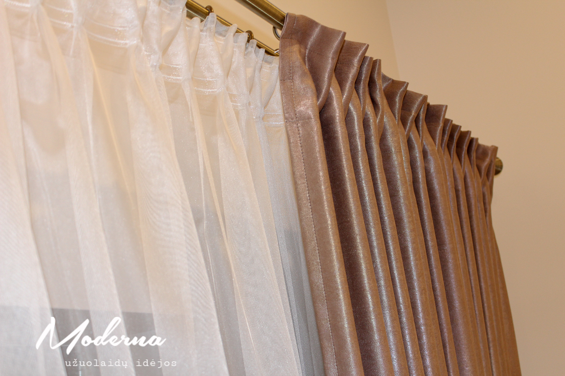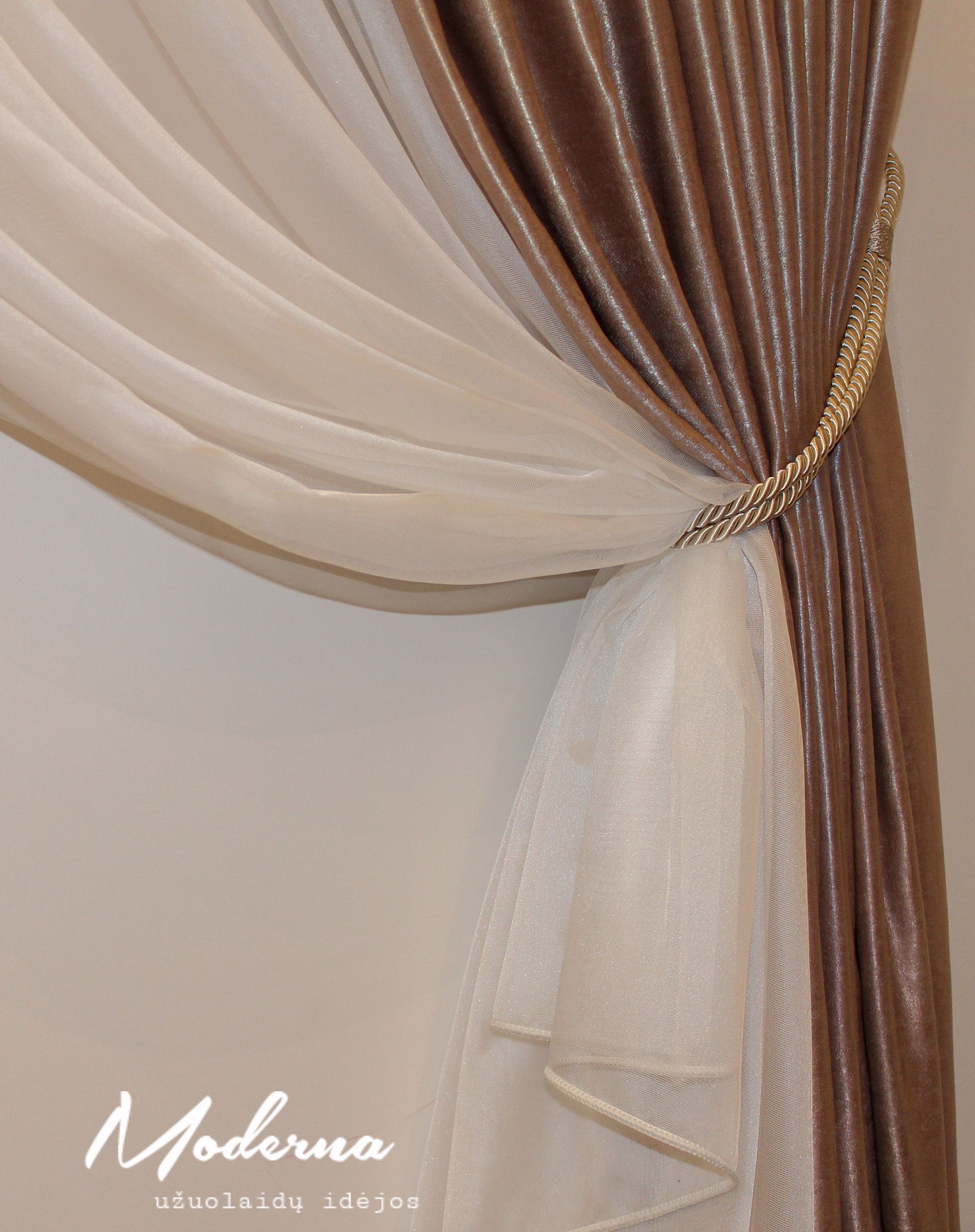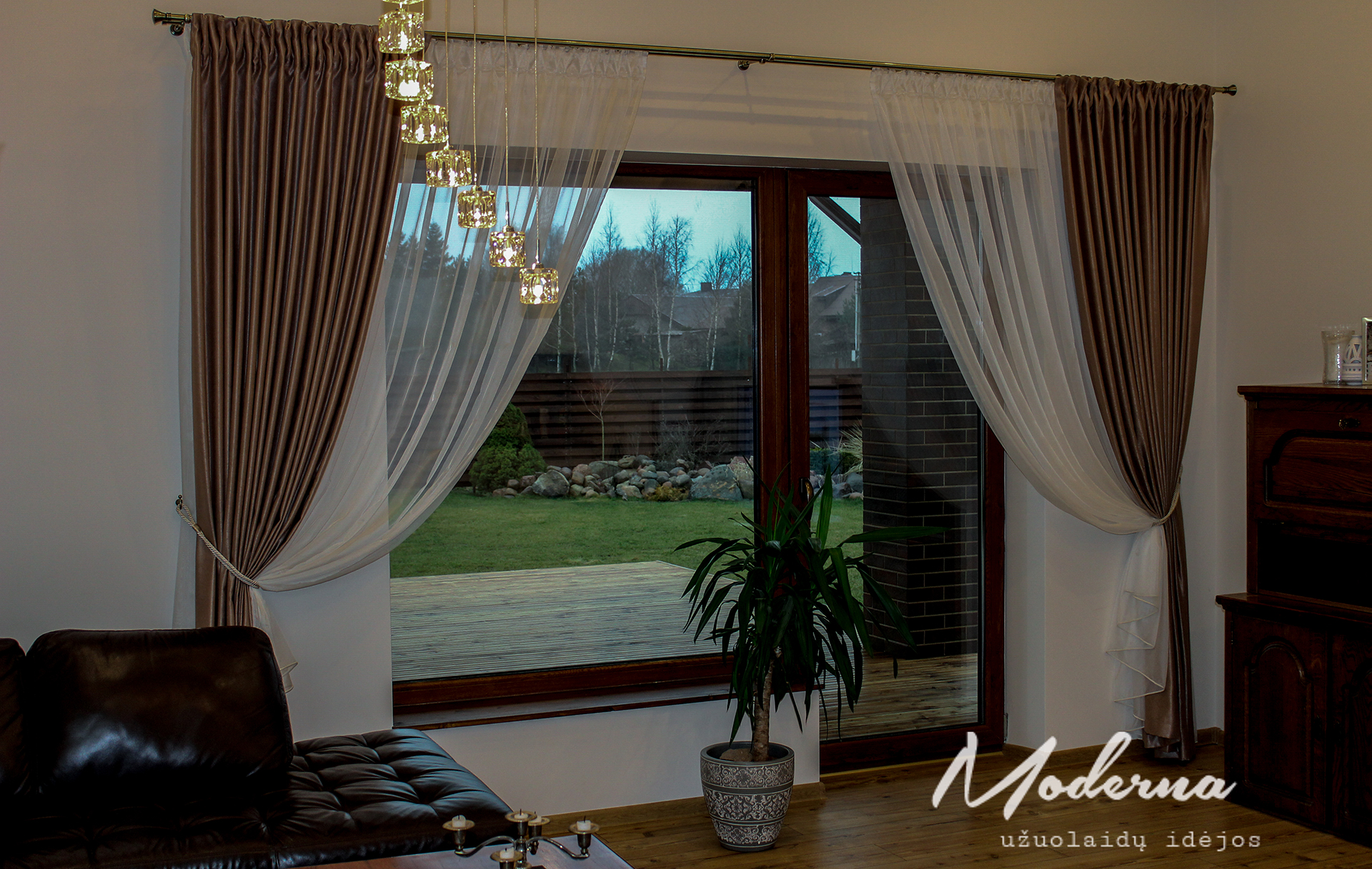 Kreminio tono naktinėmis bei baltos spalvos dieninėmis užuolaidomis stilingai papuošėm šių namų interjerą. Naktinės užuolaidos neužsitraukia- jos šioje kompozicijoje pateiktos kaip dekoracija.