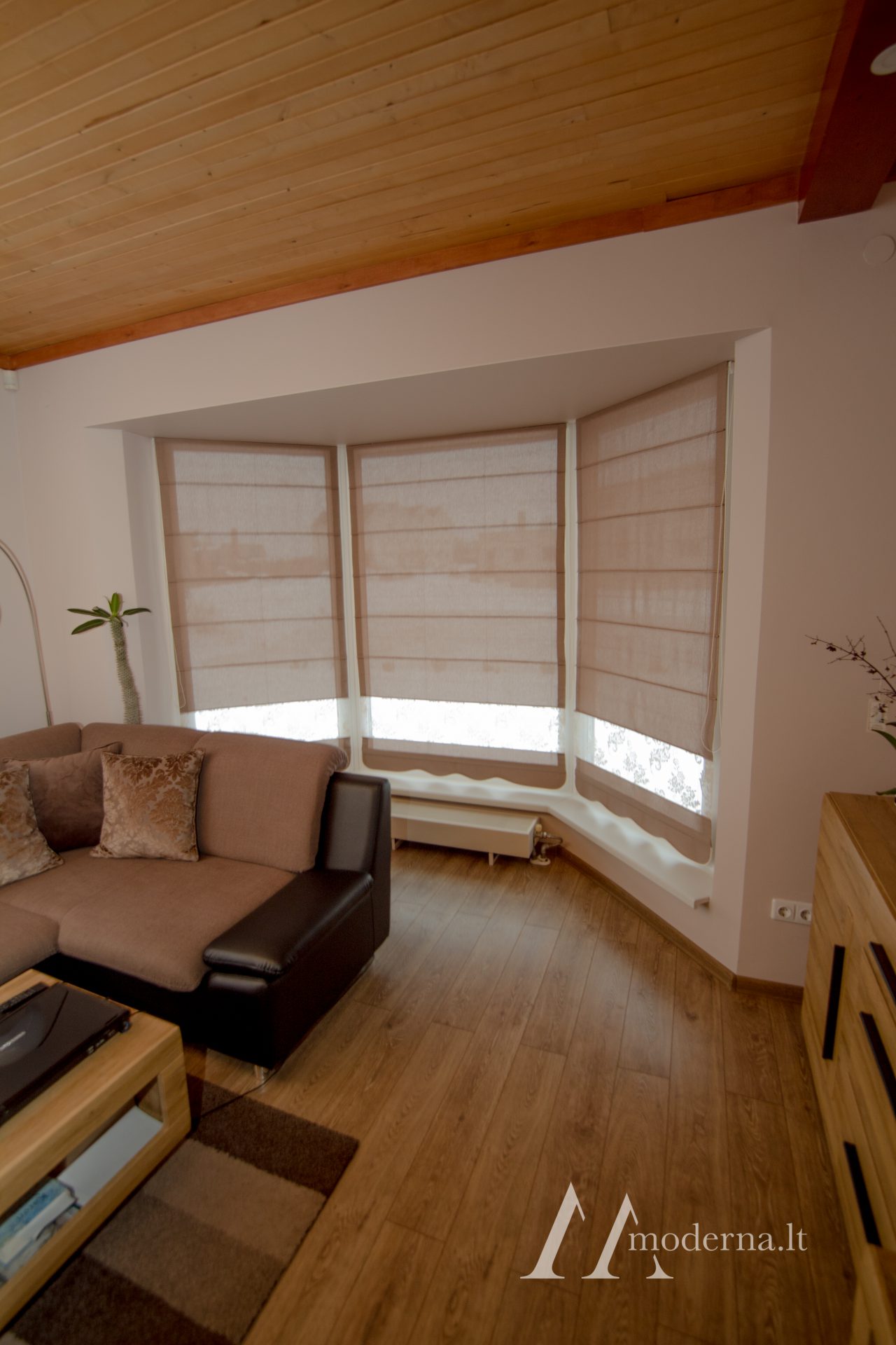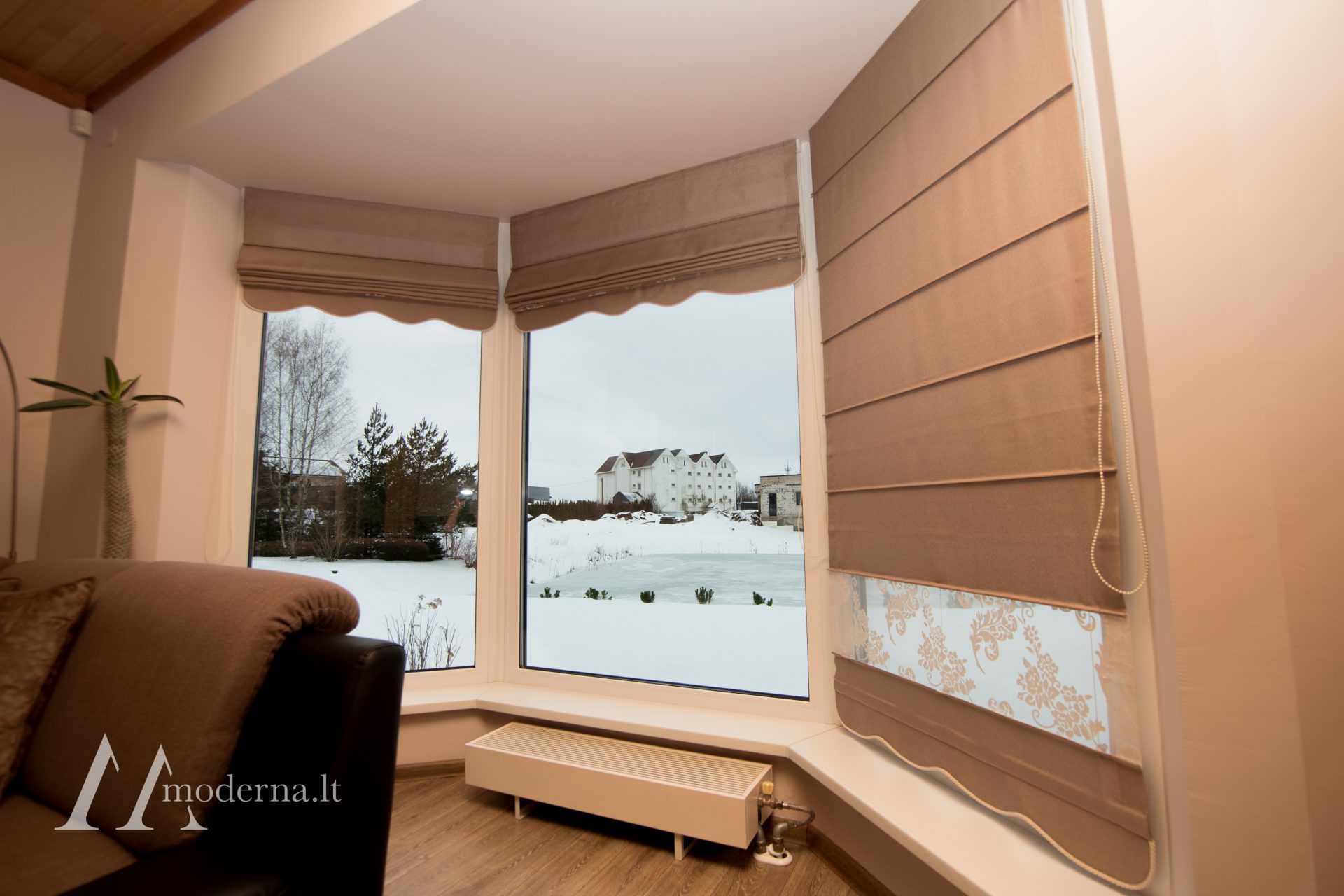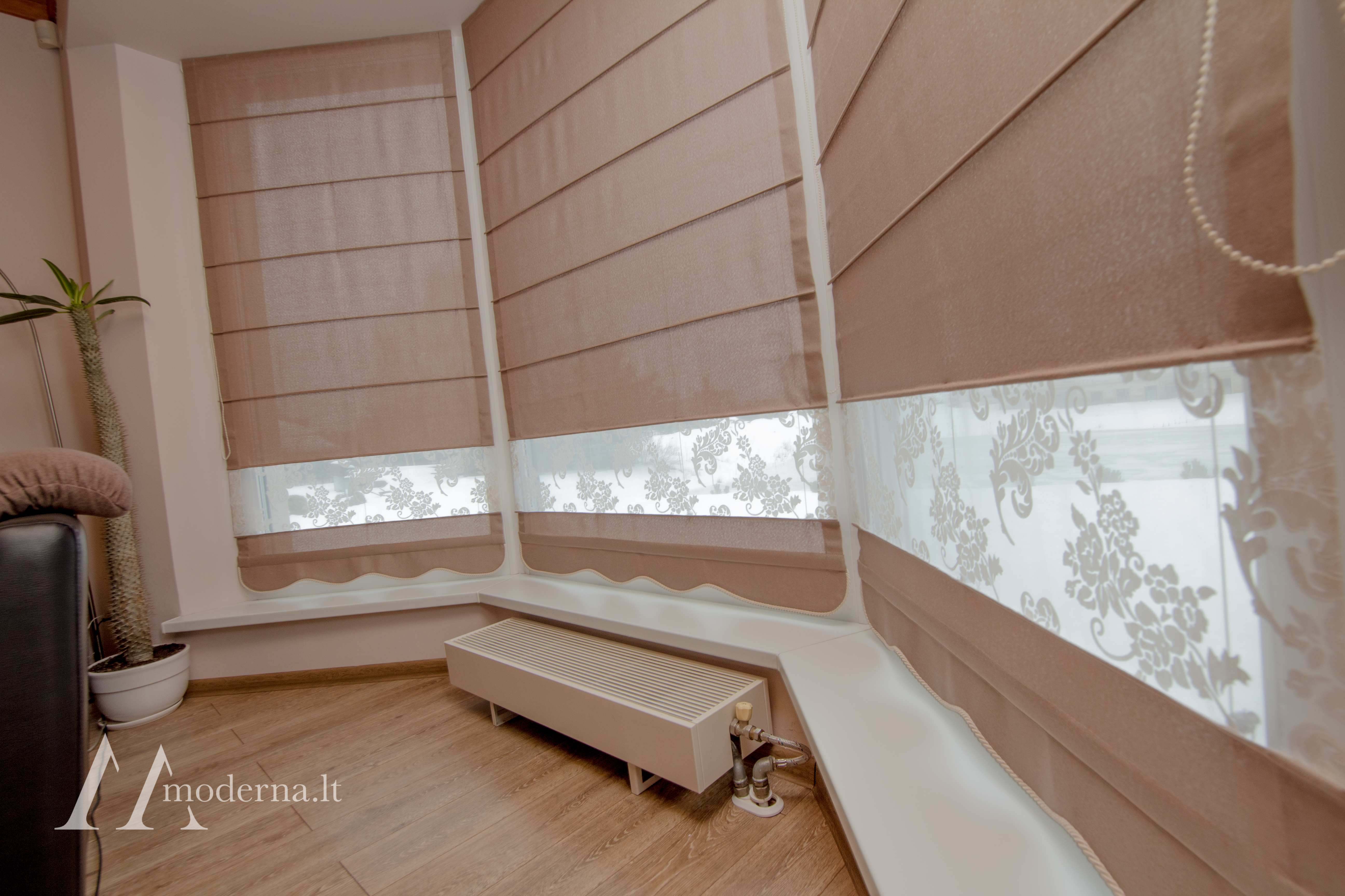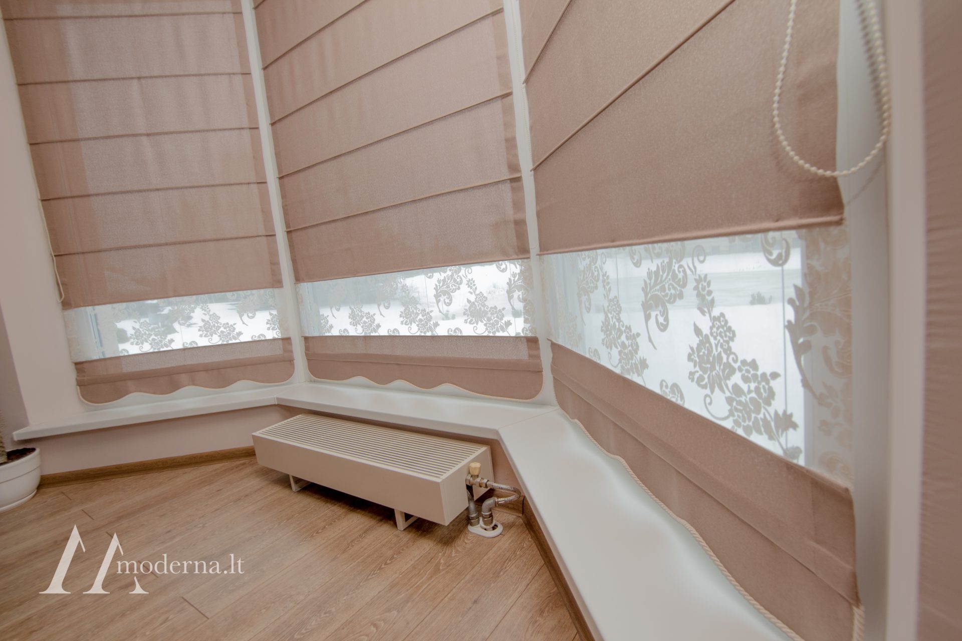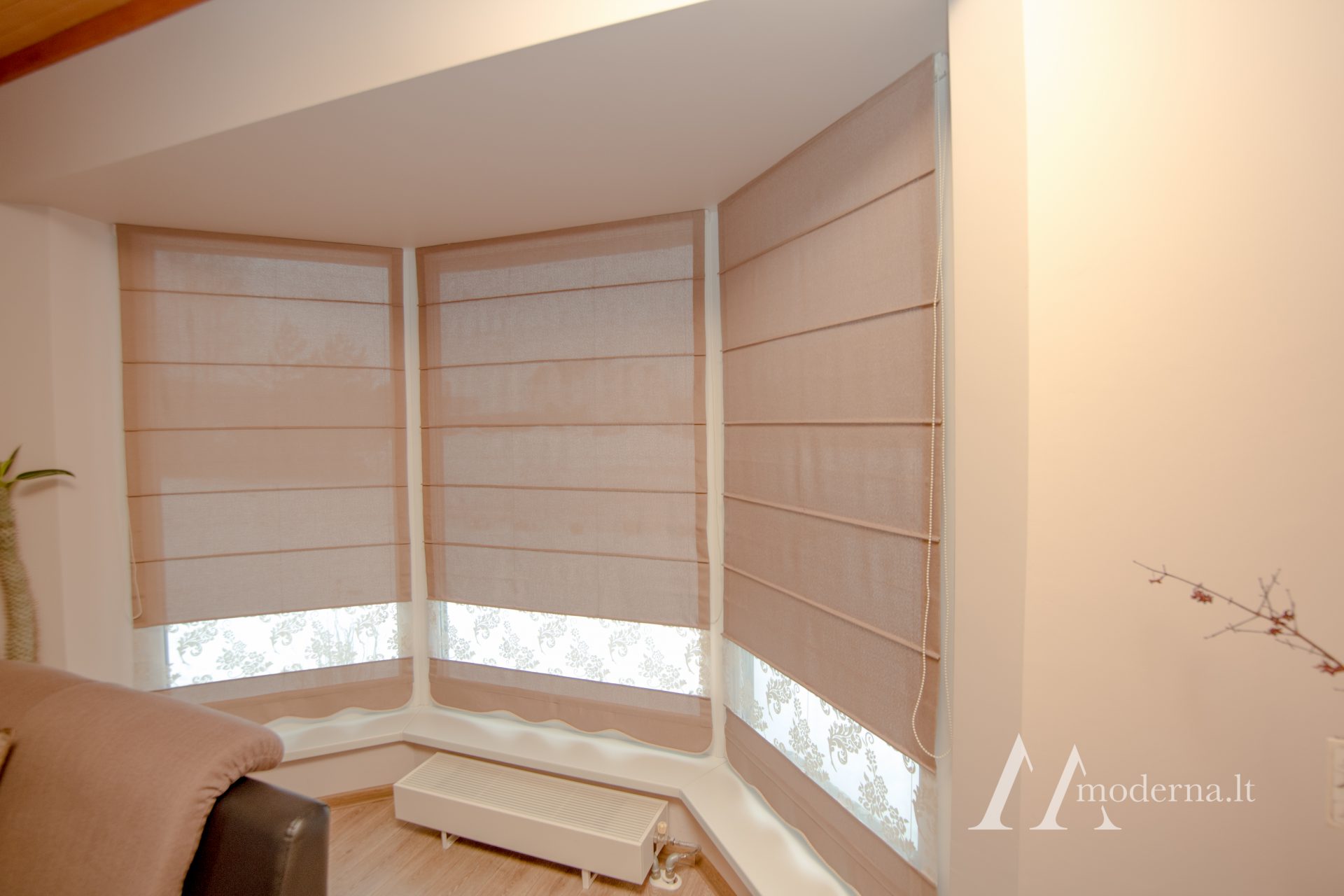 Šį nestandartinį langą paruošė 3-jų dalių romanetės. Galima pastebėti raštuoto dieninio audinio intarpą bei puošnius užbaigimus audinių apačiose. Specialiu mechanizmu užuolaidas galima pakelti ir nuleisti pagal poreikį, reguliuojant kiekvieną dalį atskirai.