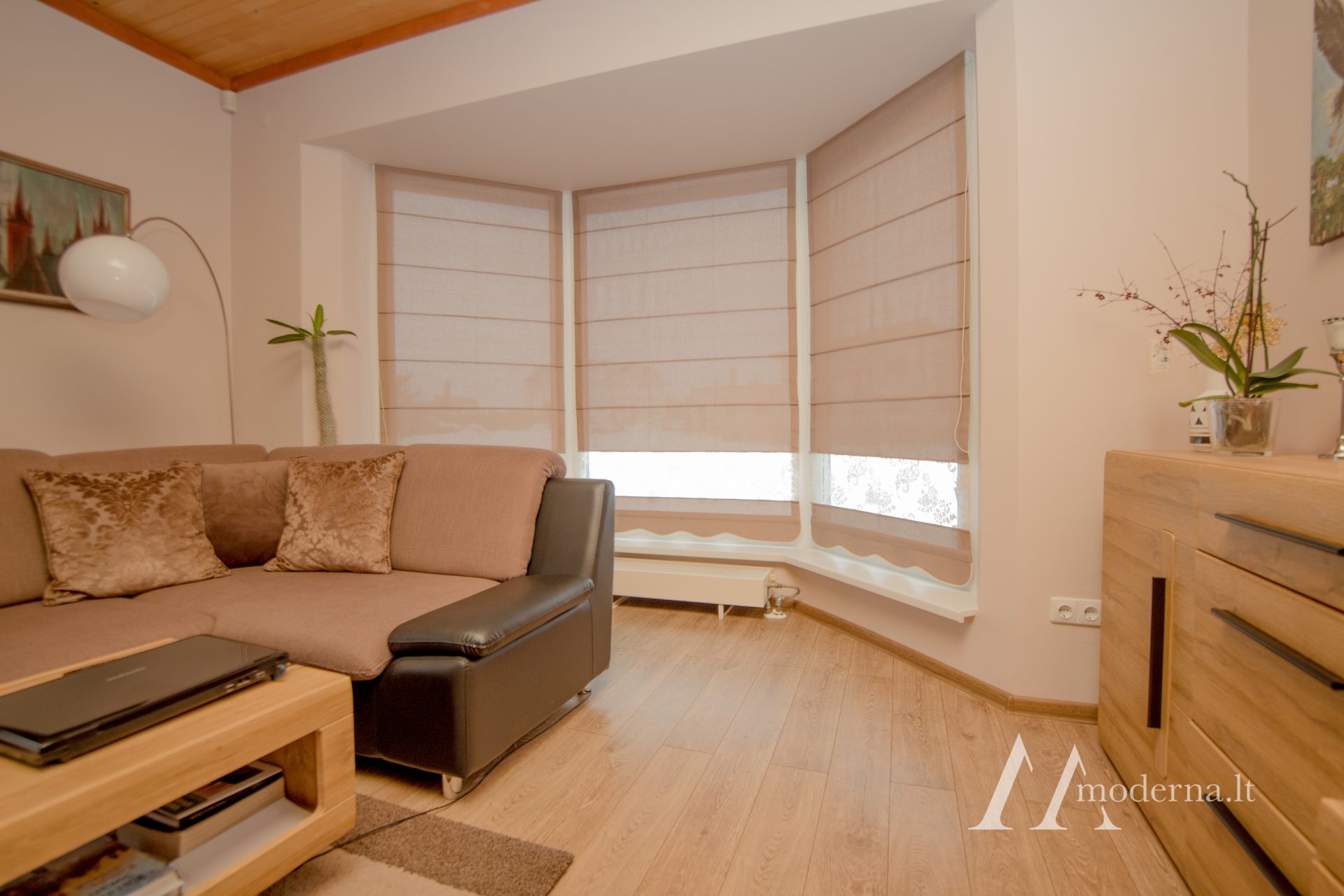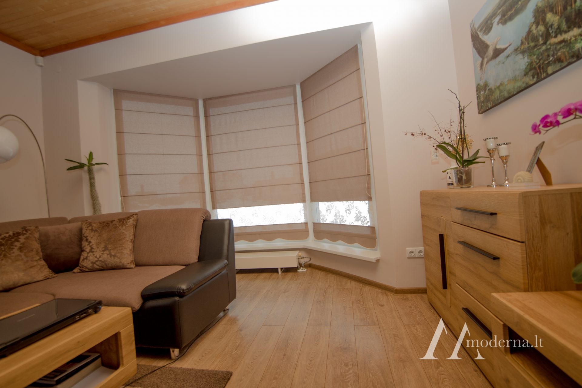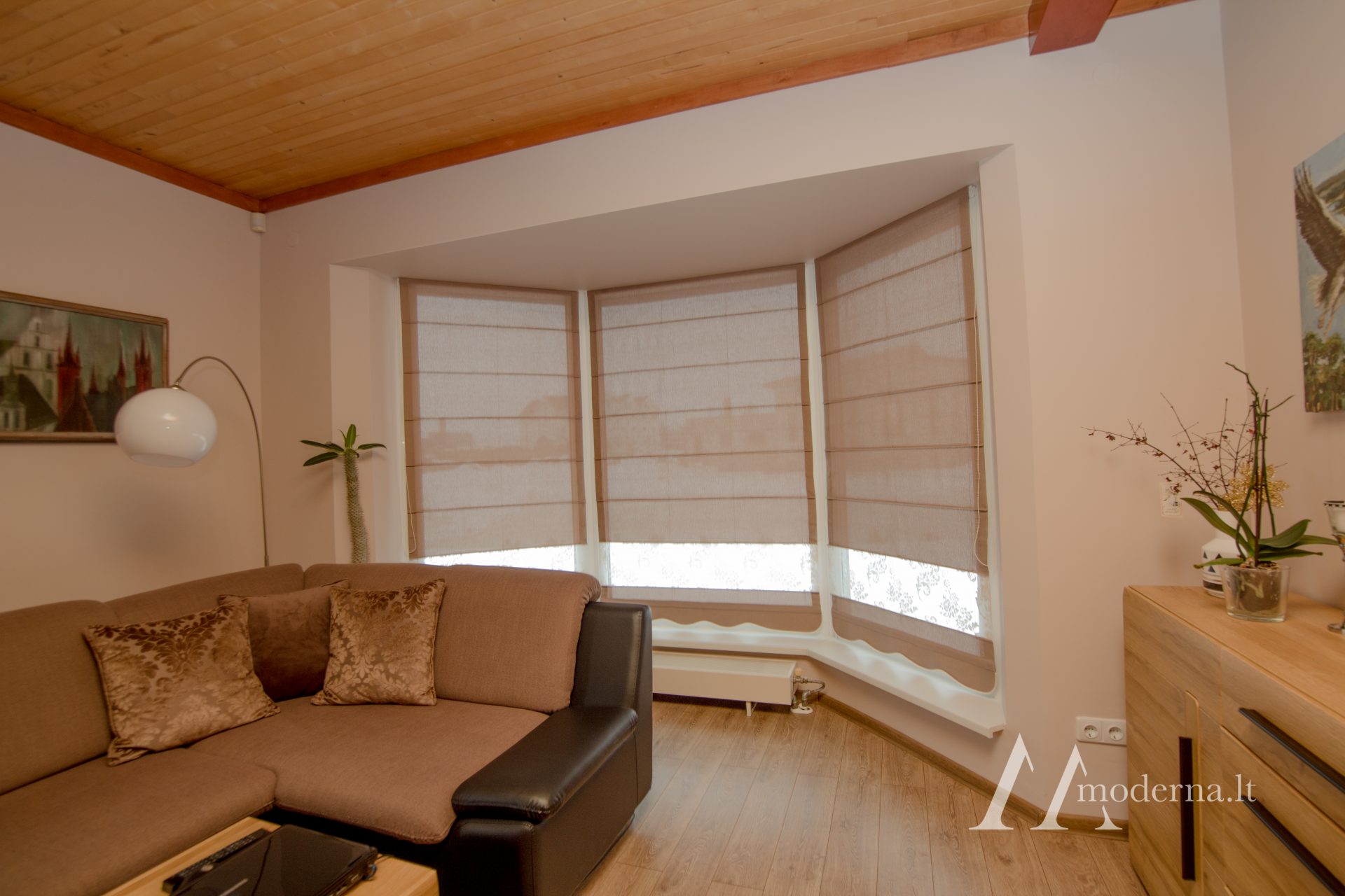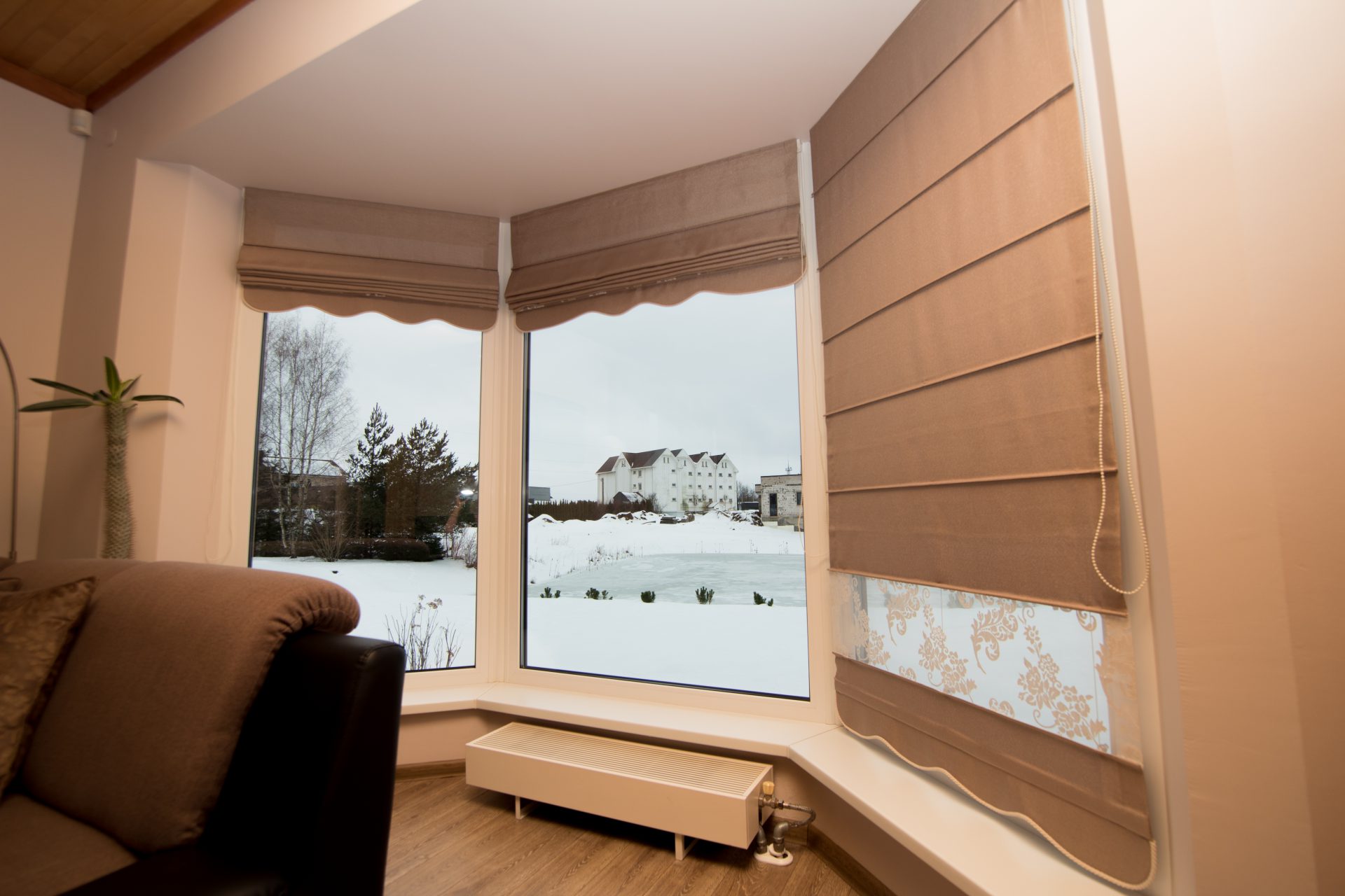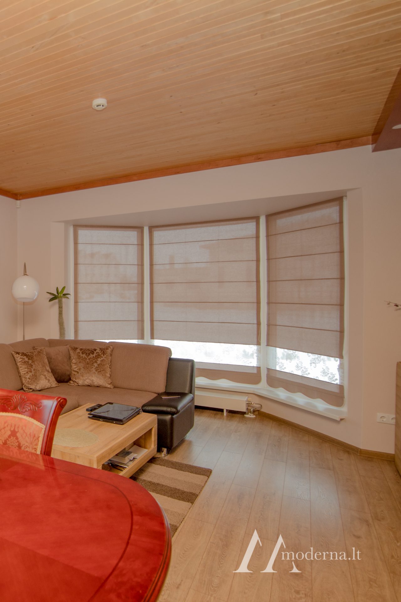 Šį nestandartinį langą paruošė 3-jų dalių romanetės. Galima pastebėti raštuoto dieninio audinio intarpą bei puošnius užbaigimus audinių apačiose. Specialiu mechanizmu užuolaidas galima pakelti ir nuleisti pagal poreikį, reguliuojant kiekvieną dalį atskirai.