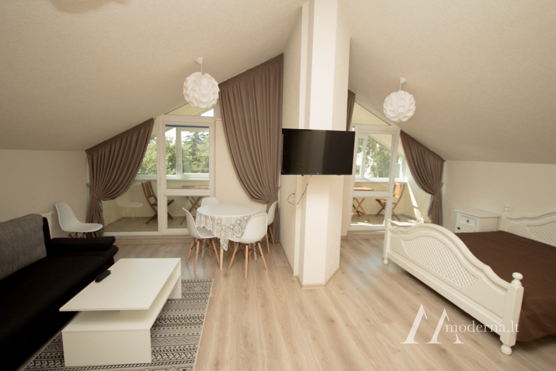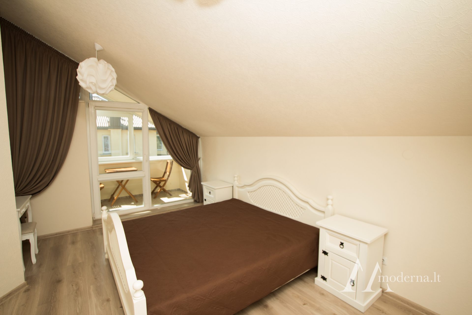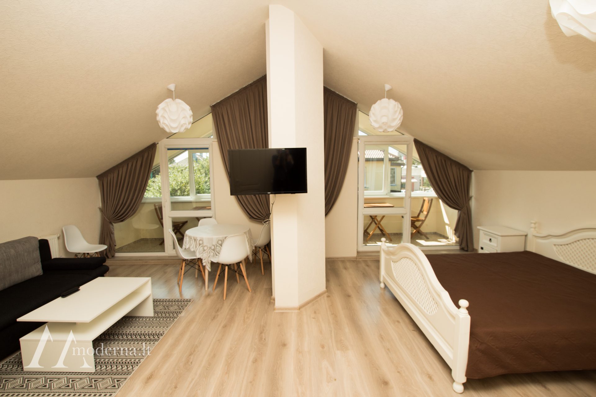 Užuolaidų sprendimas nestandartinių langų puošyboje. Audinių tonas pritaikytas prie interjero spalvų bei galutinis rezultatas suteikė kambarių erdvei jaukumo.
