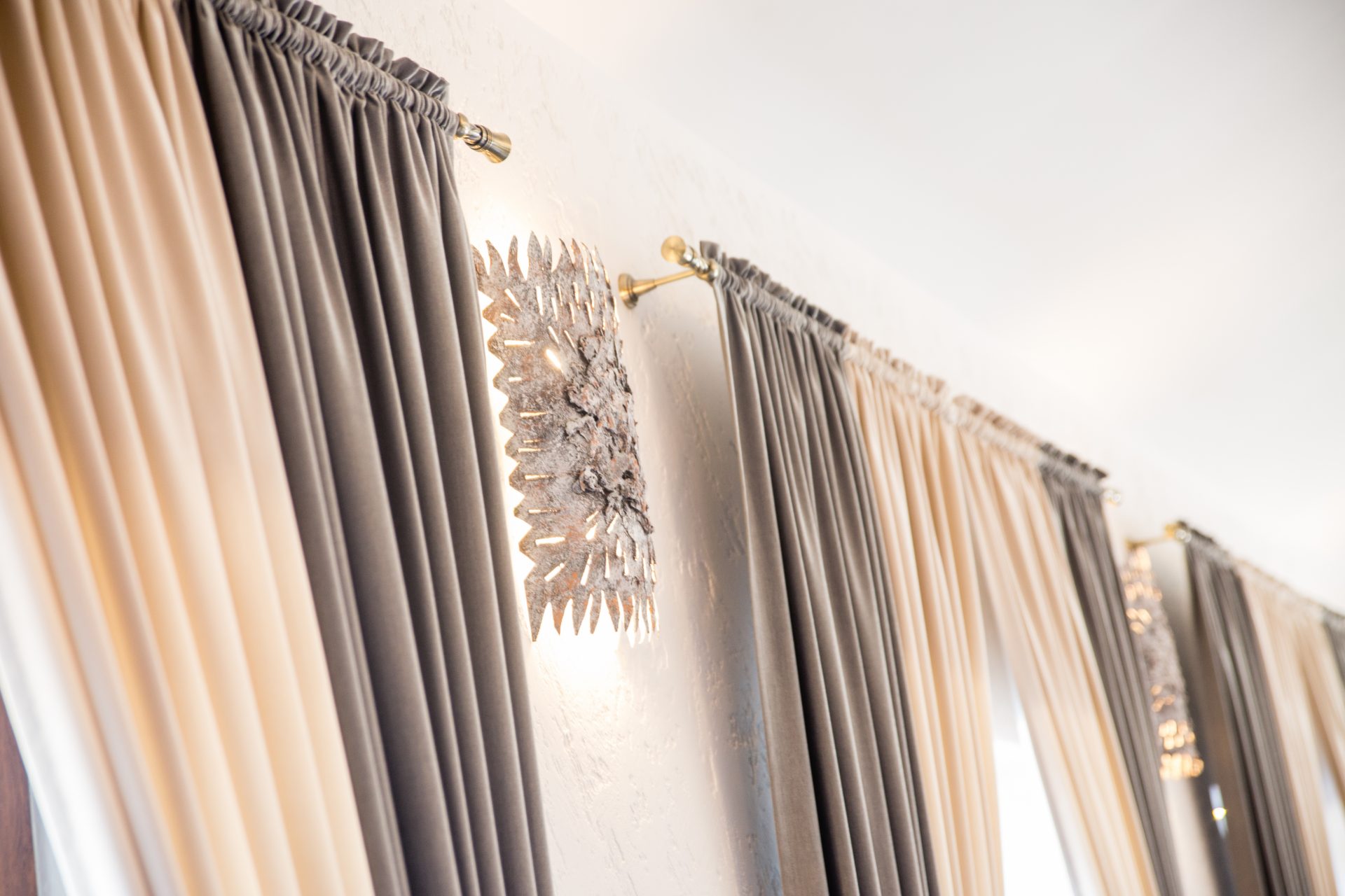 Sodybos „Stančių klėtis“ interjere- užuolaidų modelis be drapiravimo juostelės, kombinuojant dviejų spalvų audinius bei veriant juos per karnizą. Apatinė dalis aukščiau nei įprasta, kad audinys nesiteptų, būtų patogu ir praktiška prižiūrėti grindis. Papildomi aksesuarai – prabangūs kutai paloms parišti.