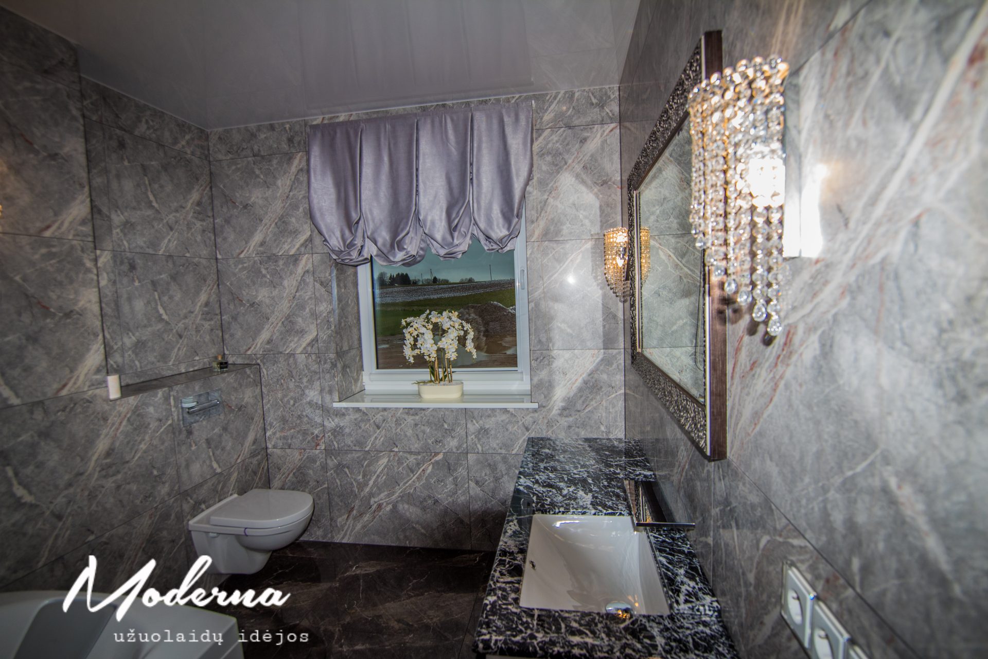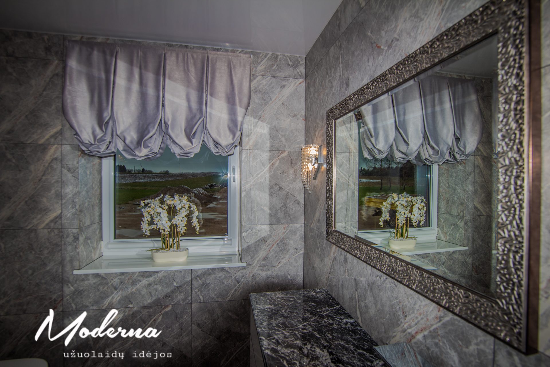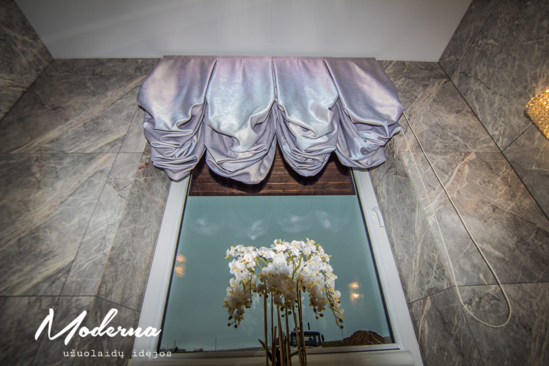 Vonios kambariui – pilko naktinio audinio austrijietė. Specialaus mechanizmo pagalba galima pakelti arba nuleisti audinį.